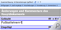 Der Überarbeitungsmodus lässt sich beliebig ein- und ausschalten. Nur im aktivierten Zustand merkt sich das Textverarbeitungsprogramm, welcher Bearbeiter welche Änderungen vorgenommen hat. Jede einzelne Korrektur lässt sich dabei betrachten, annehmen oder ablehnen. Man kann auch von Korrektur zu Korrektur springen oder per Mausklick eine Änderung rückgängig machen.